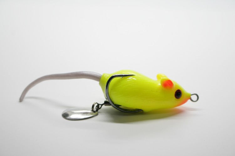 MOUSE VIB Gummimaus für das Oberflächen angeln. Ausgestattet ist die Gummimaus mit scharfe Zwillingshaken, langen Schwanz und sehr Auffällige Farbe. Bei dieser Variante ist die Maus mit einem Spinnerblatt bestückt, die zusätzlich Aufmerksamkeit erregt.